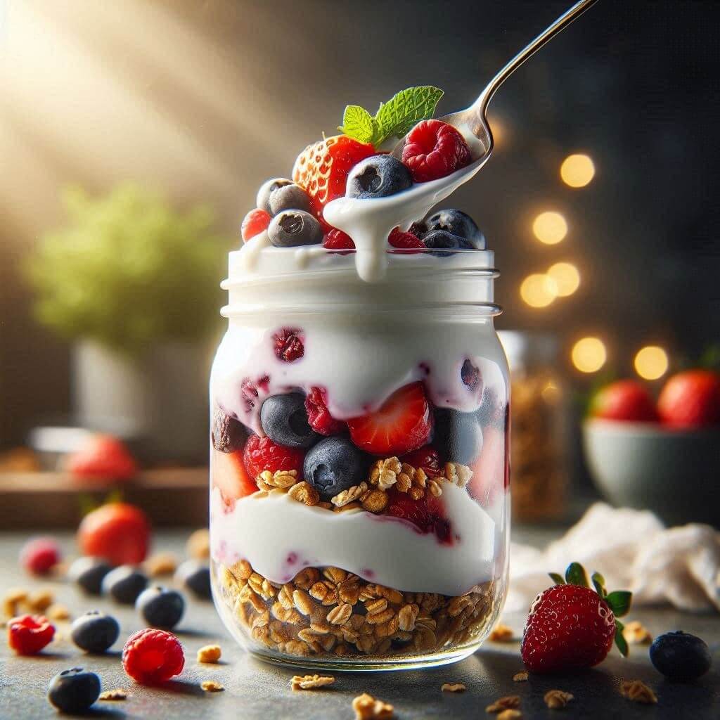 No need for a grocery haul here – this comes together with basics. I always keep a tub of plain Greek yogurt in the fridge because it lasts forever and works for everything from dips to smoothies. For fruits, I pick whatever’s ripe; berries shine brightest, though. Granola? I snag a low-sugar kind to avoid extra junk.