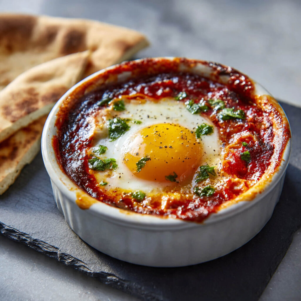 Some mornings, I don’t want a big skillet of shakshuka. I don’t want leftovers. I don’t want to wash half my kitchen. I just want one cozy, perfectly baked egg in spicy tomato sauce, served in a little ramekin that makes me feel like I tried harder than I did.