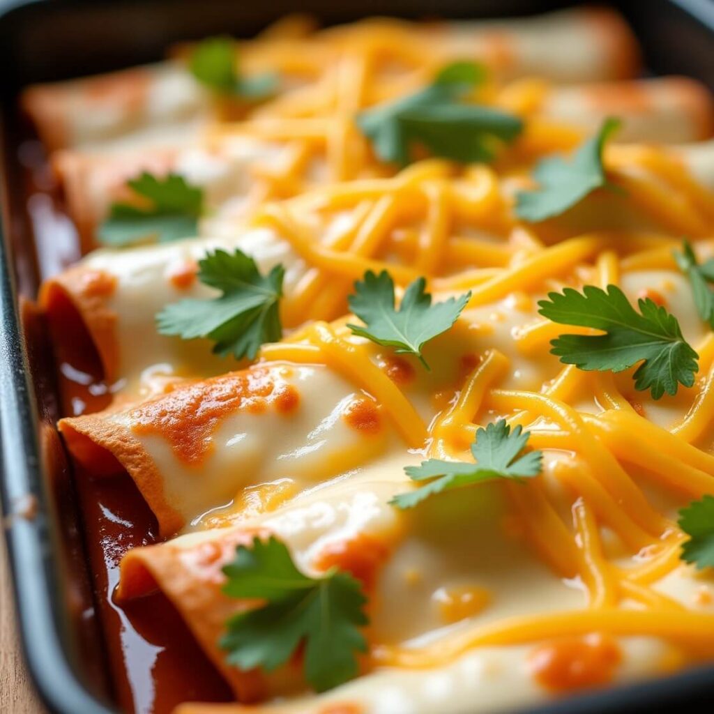 You want those tortillas packed but not bursting. Roll ’em tight, line them up snug in a greased 9×13 dish, and drown them in the creamy white sauce. Sprinkle extra cheese on top because… cheese.