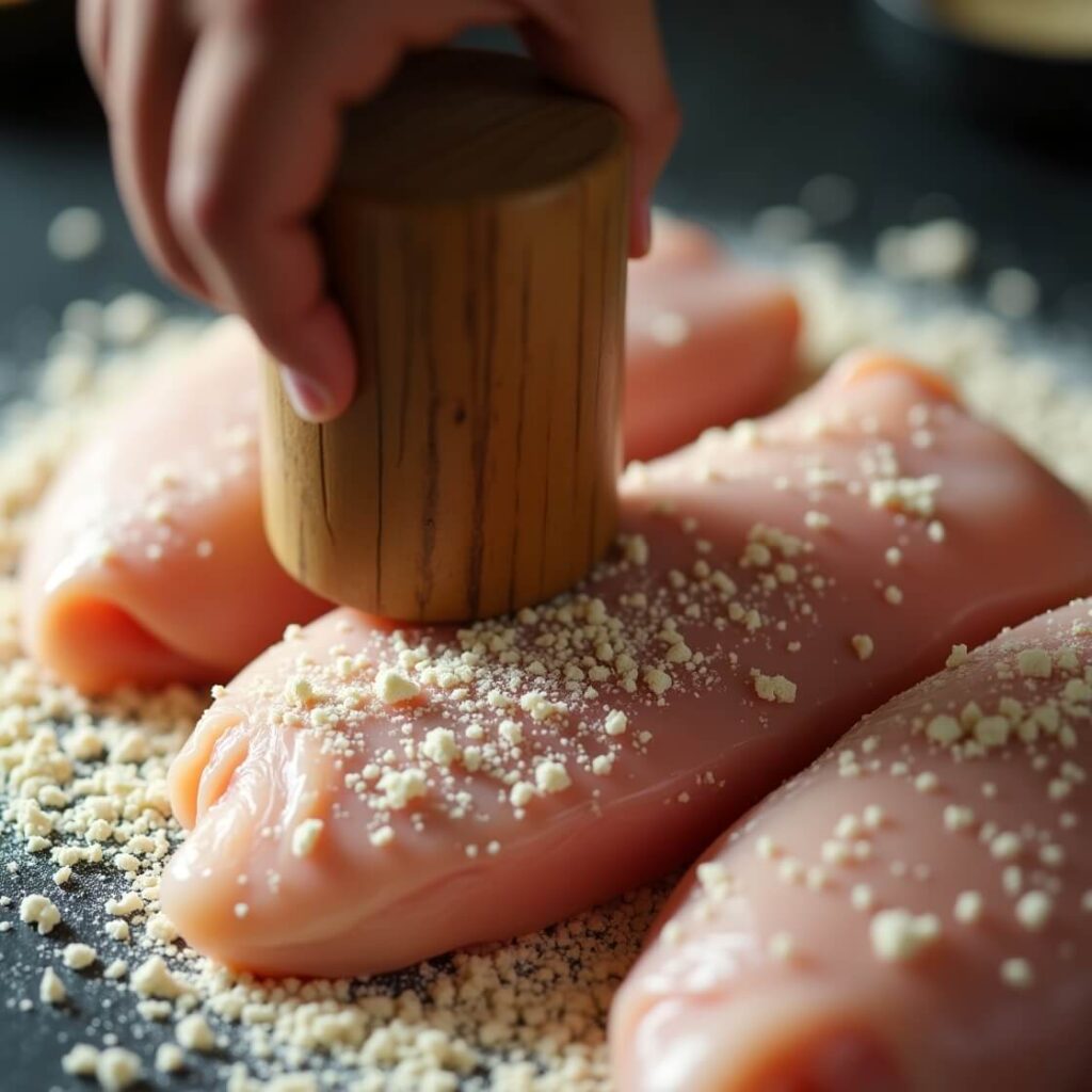 - Coat it: Dredge the chicken in flour first (don’t skip this!), dunk it in egg, then bury it in that breadcrumb mixture. Press firmly—this is where the crunch comes from, so don’t be shy! You might make a mess; that’s just kitchen life.