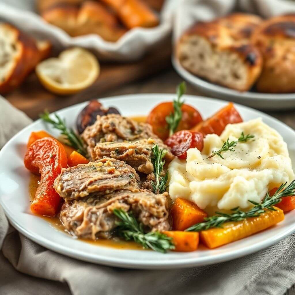 Rub pork with herbs and garlic, slow cook with onions and broth. Shred and serve with mashed potatoes or roasted veggies.