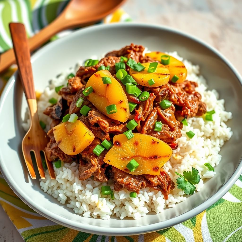 Season pork with salt, lay it on onions, drench with liquid smoke and broth, then slow cook. Serve over rice. Instant tropical vibes, no grass skirt needed.