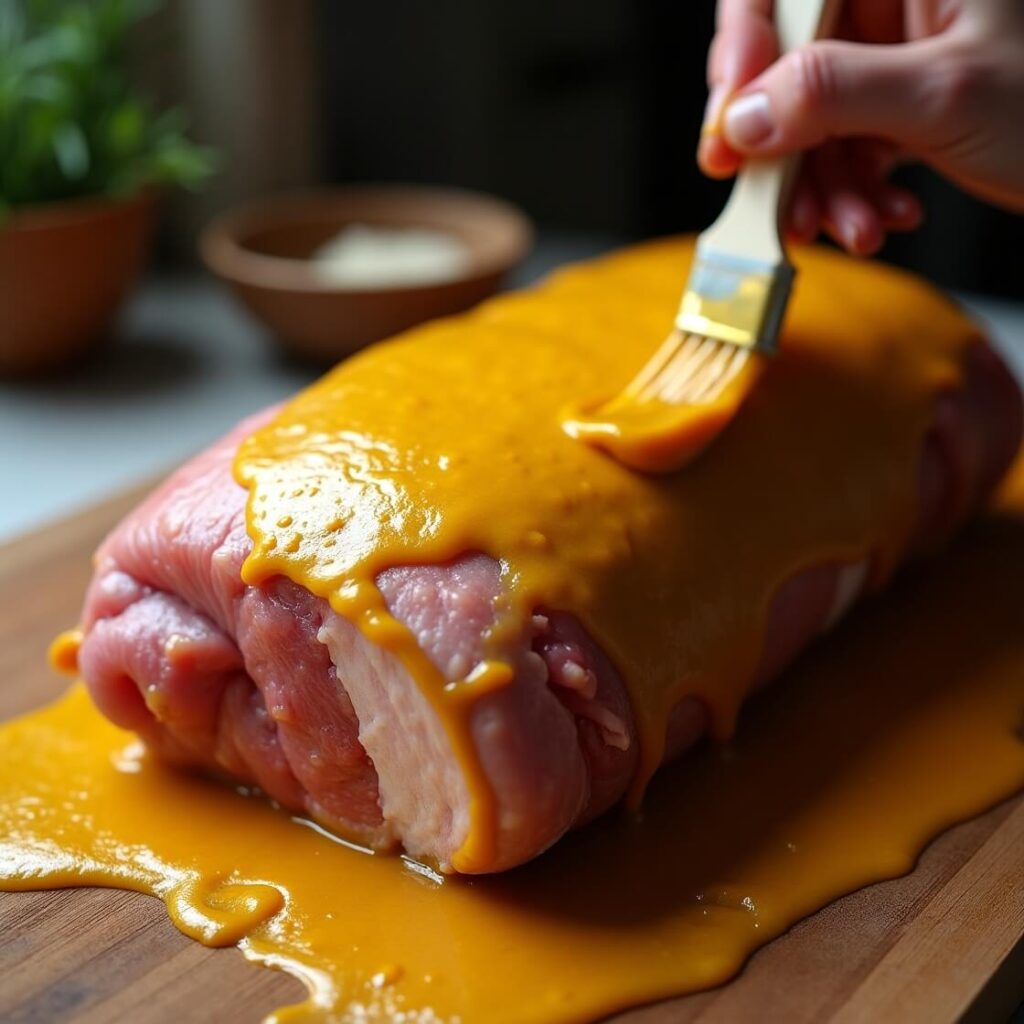- Generously slather that pork with yellow mustard—you’ll almost think, “What the heck?” But trust me.