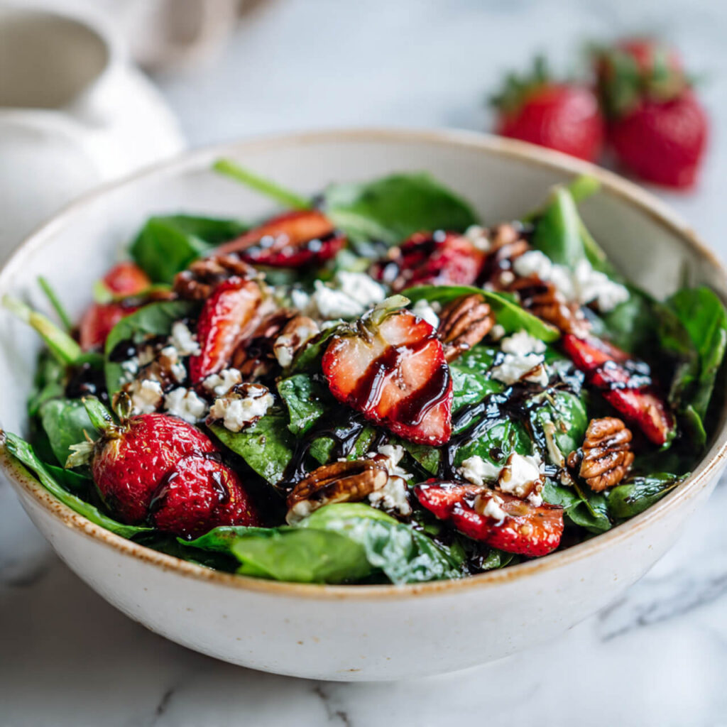 Quick rant: I used to think salads needed 20 ingredients to be impressive. Then I started making this one. One afternoon, I threw it together because I had leftover strawberries and a huge box of spinach starting to look tired. I whisked a quick dressing, tossed in candied pecans from a snack bag (yes, really), and… magic happened.